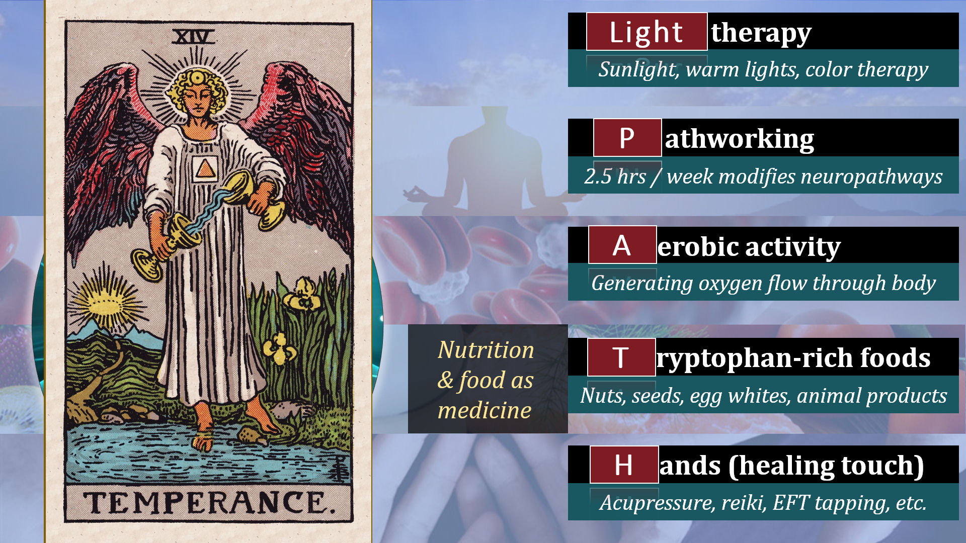 This is achieved through the LMATH approach we cover in the PowerPoint: forms of light therapy, meditation and pathworking, aerobic activity, considering food as medicine, and forms of faith healing by touch.