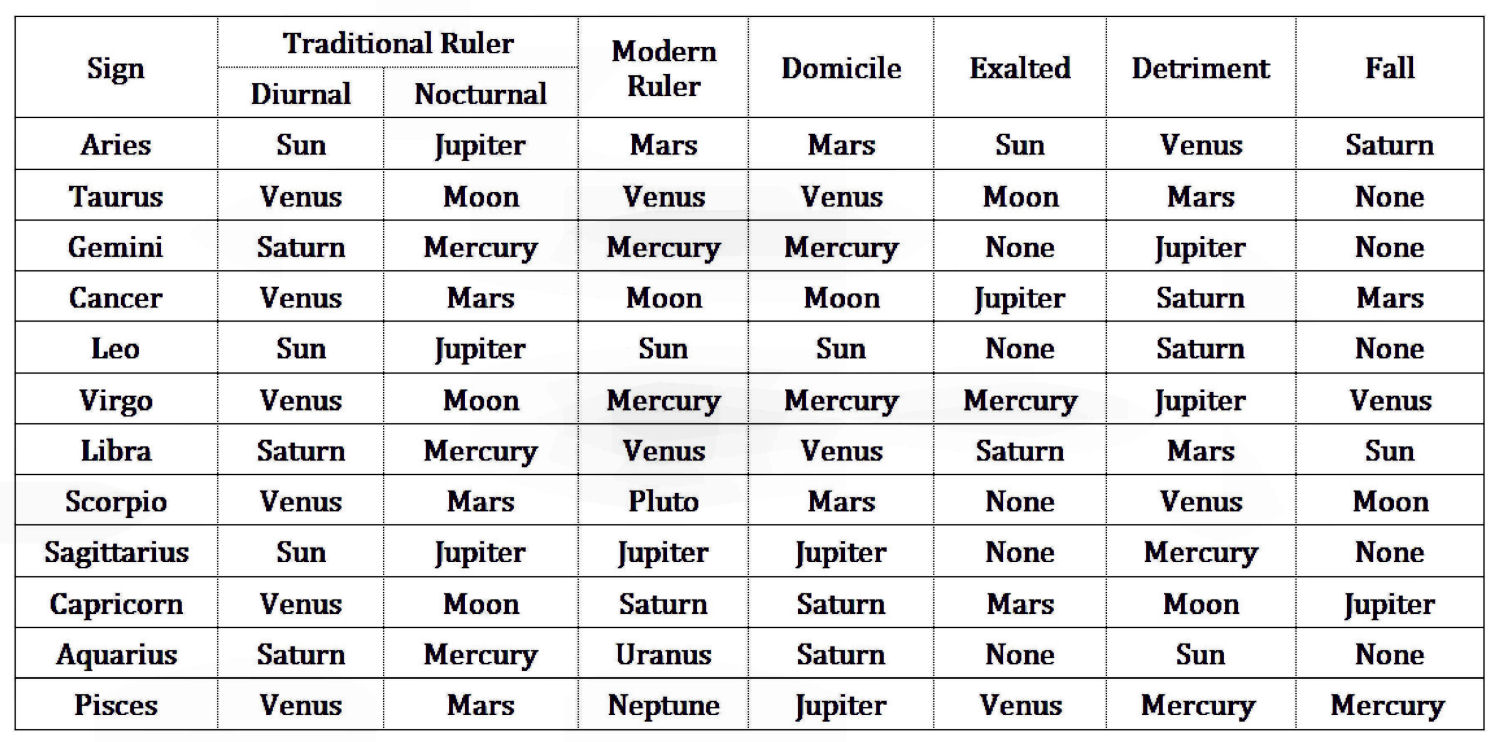 In astrology, the qualitative state of the celestial bodies are affected by which zodiac sign they’re positioned under. The 17th century astrologer William Lilly described these qualitative states as essential dignities, either strengthening the innate qualities of the planet or debilitating and weakening the innate qualities of the planet.