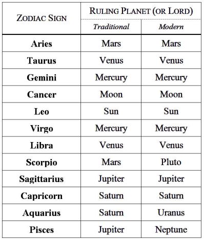 As indicated earlier, every sign has a corresponding ruling planet. Some astrologers observe the day-night rulerships in the above table. E.g., all Fire signs, Aries, Leo, and Sagittarius, are ruled by the Sun if it’s a diurnal chart, but ruled by Jupiter if it’s a nocturnal chart; all diurnal Air signs, Gemini, Libra, and Aquarius, are ruled by Saturn, while nocturnal Air signs are ruled by Mercury.
