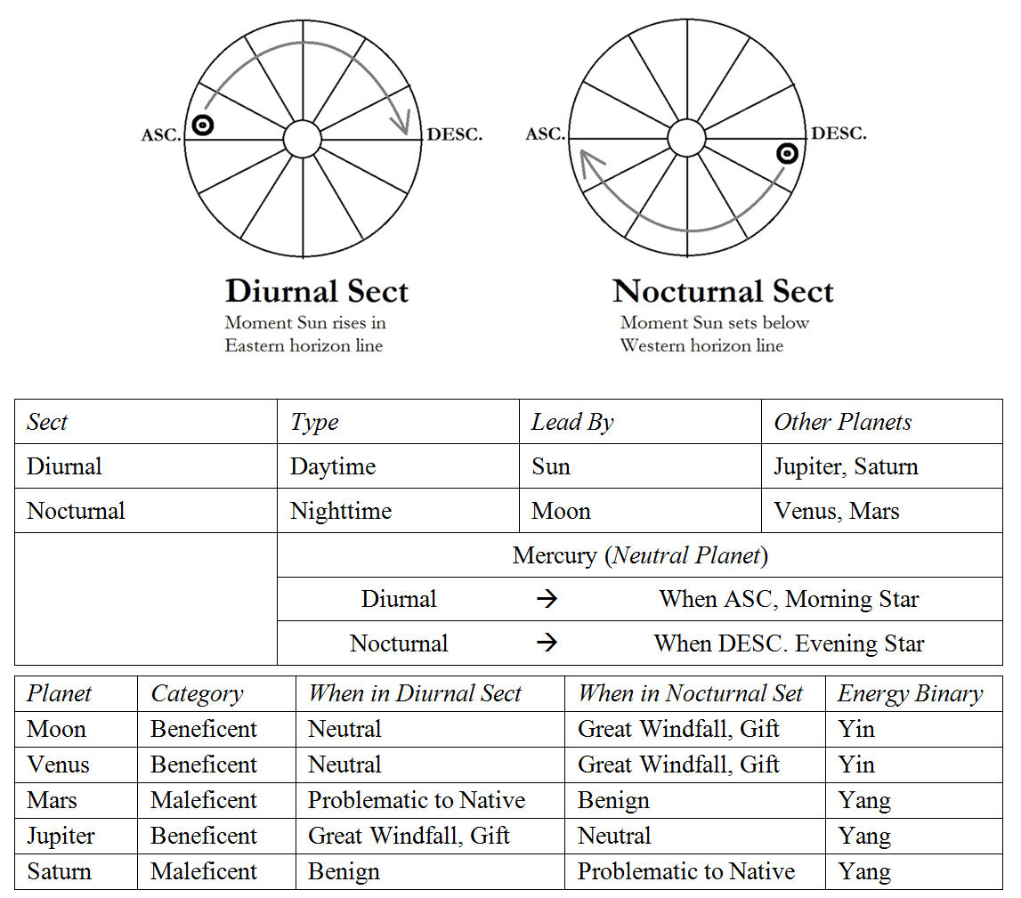 The celestial bodies may tend to act differently depending on which sect they’re in. There’s microscopic analysis of individual parts and then there’s macroscopic analysis of how the various parts interact with one another (i.e., aspects) and even patterns that the celestial bodies form on the chart.