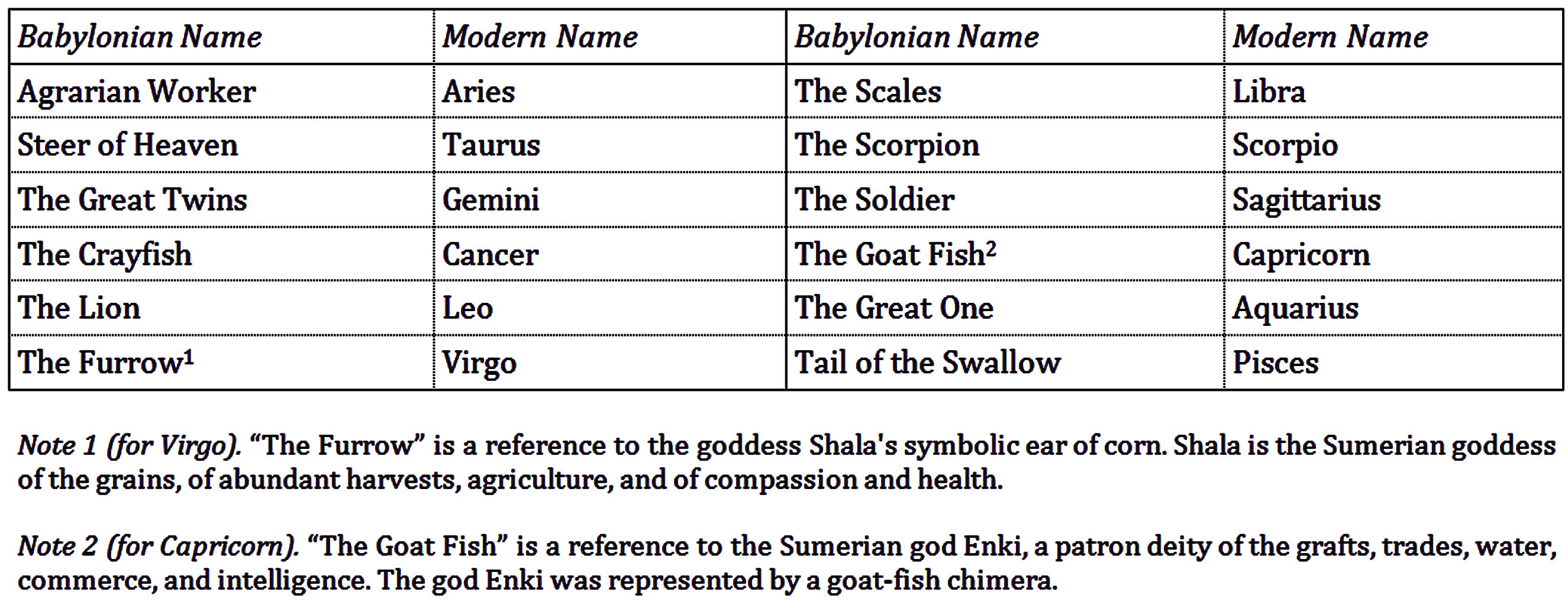 In the Babylonian star catalogs, the twelve signs were assigned names, which have become the predecessors of the names we ascribe to the twelve zodiac signs today.