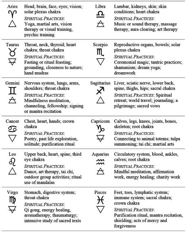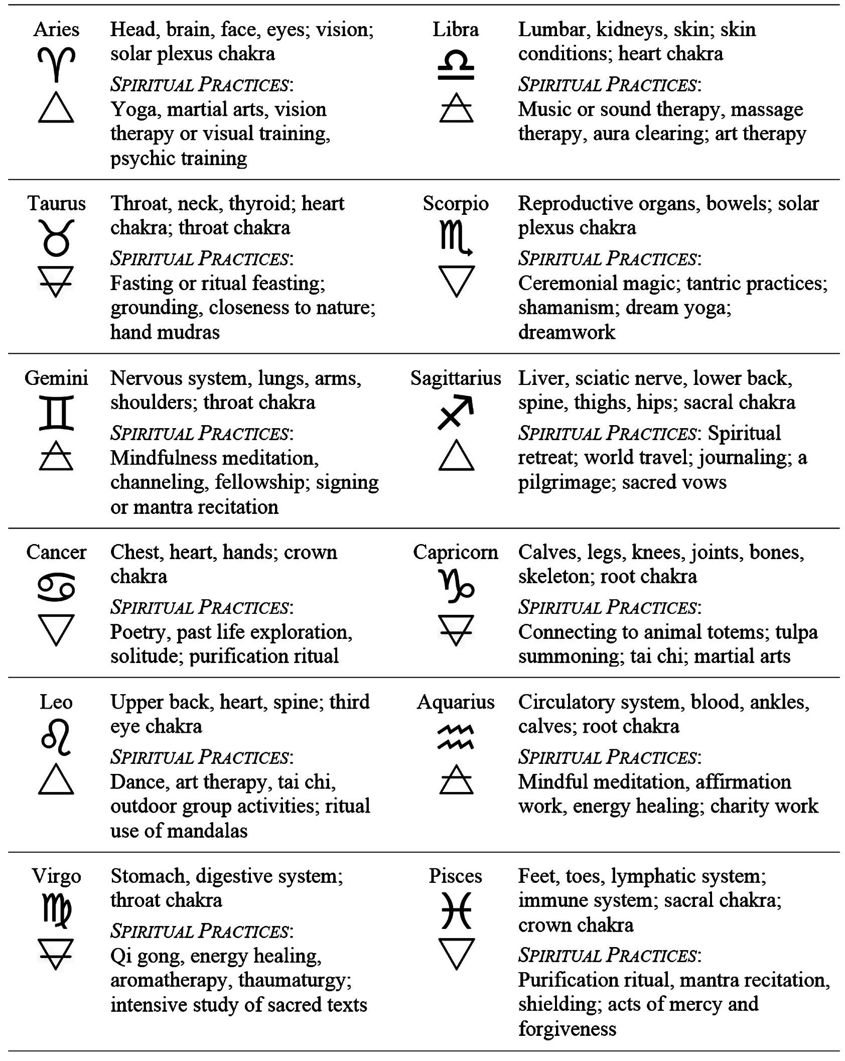 Per medieval medical astrology, the twelve zodiac signs correspond with parts of the body, head to toe. In modern astrology, certain types of spiritual practices are also attributed to the twelve signs. In totality, the above reference table provides both physical and spiritual health correspondences.