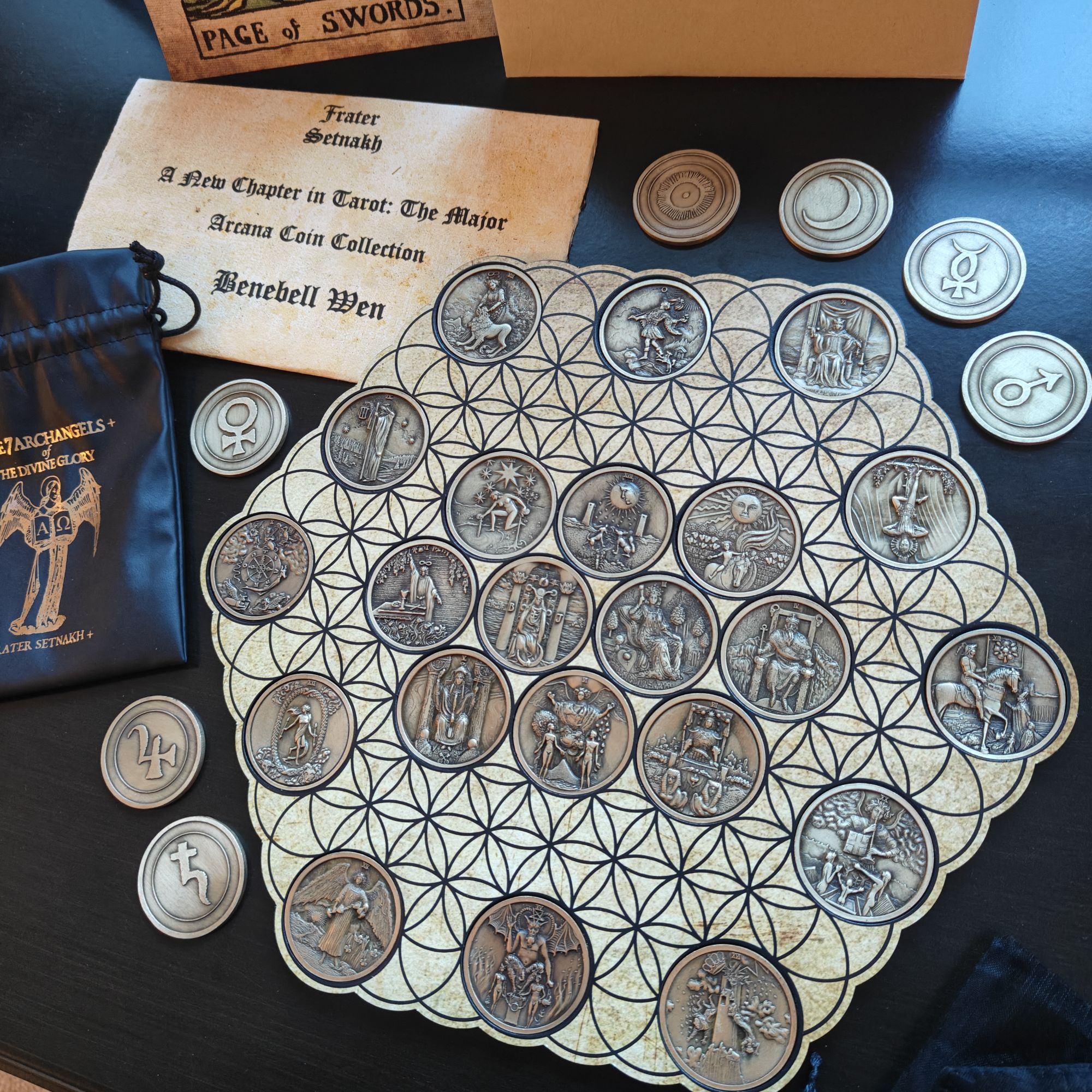 Frater Setnakh is one of the most incredible, detail-oriented artisans of ritual artifacts I’ve come across. I’ve previously reviewed the 72 Angels Talisman Coins and Cards he sent me, which I keep on display in my sitting room. Here I’ll be showcasing his latest offering, Tarot Coins, along with the Guardian Angel Coins, or Seven Archangels.