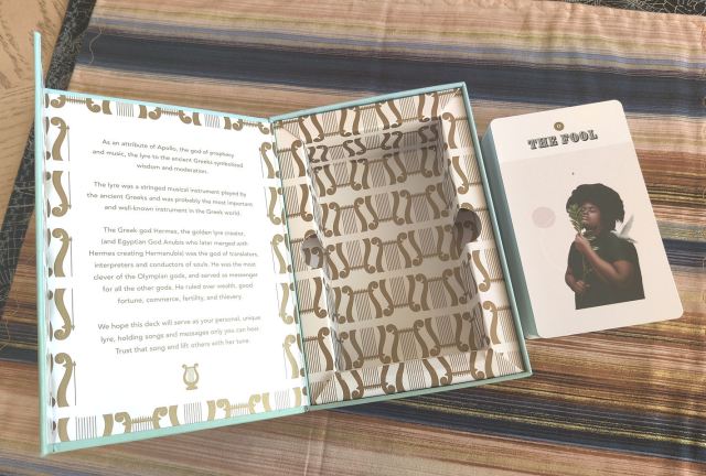 The deck’s namesake is attributed to Apollo’s lyre, Apollo being the god of prophecy and music, and the lyre a symbol of wisdom and moderation. Hermes was the creator of the golden lyre. Later merged with the Egyptian god Anubis to create the syncretized Hermanubis, the namesake also calls upon the god of translators, interpretors, and conductors of souls. Likewise, the Gold Lyre Tarot holds songs and messages that only you can hear.