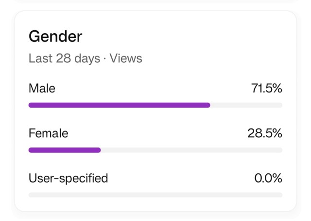 I didn’t follow the analytics too closely, so I can’t pinpoint exactly when the shift happened, but in early 2023, per the screenshot image above, I noticed suddenly that the demographics were closer to 50/50, which is in fact strange for the tarot and witchy communities and stranger yet for female-presenting content creators like me. You don’t typically see 50/50 demographics for viewership when it comes to tarot and witchy content. There’s typically an underrepresentation of men.