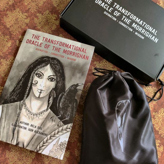 The Transformational Oracle of the Morrighan by Bela Síol and illustrated by Igor Alexandre is a mostly black-and-white illustrated deck with accents of color. The Oracle set is an invaluable resource for anyone seeking connection to the Morrighan.
