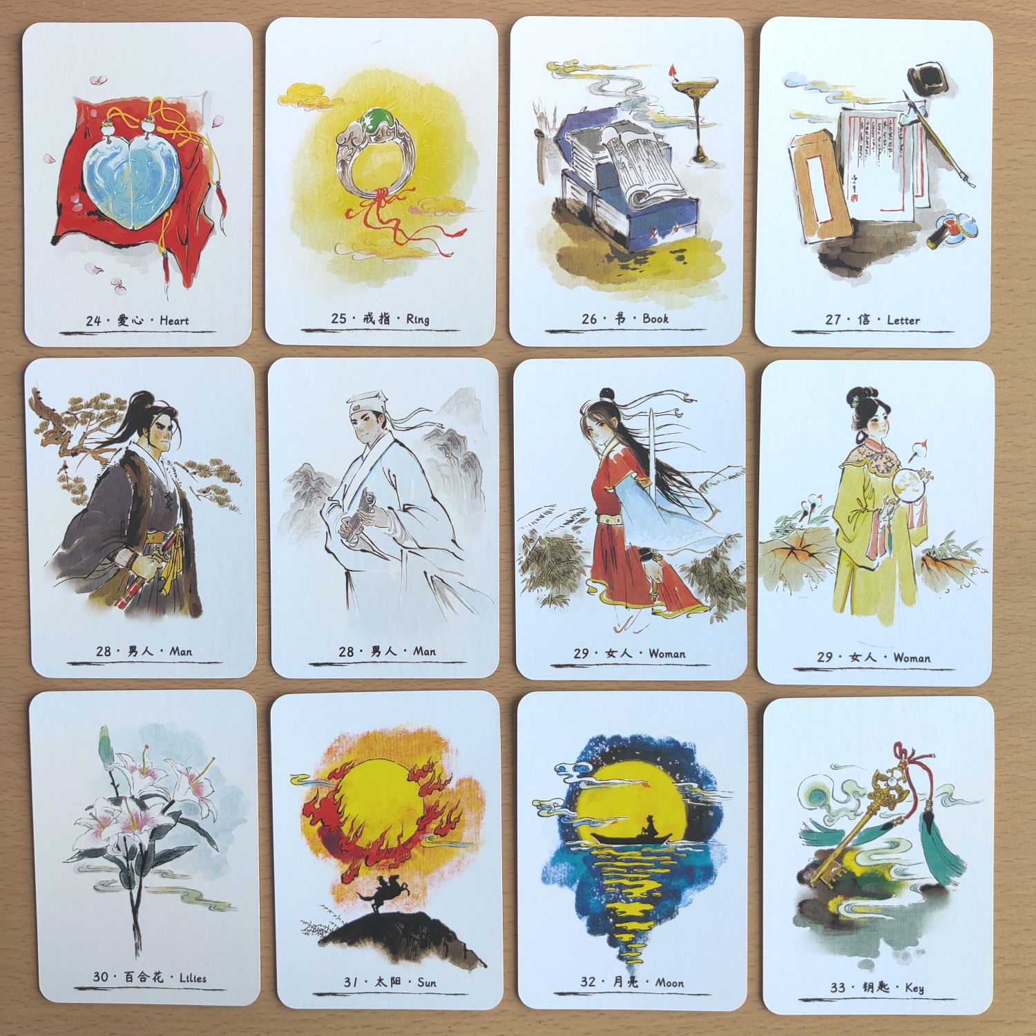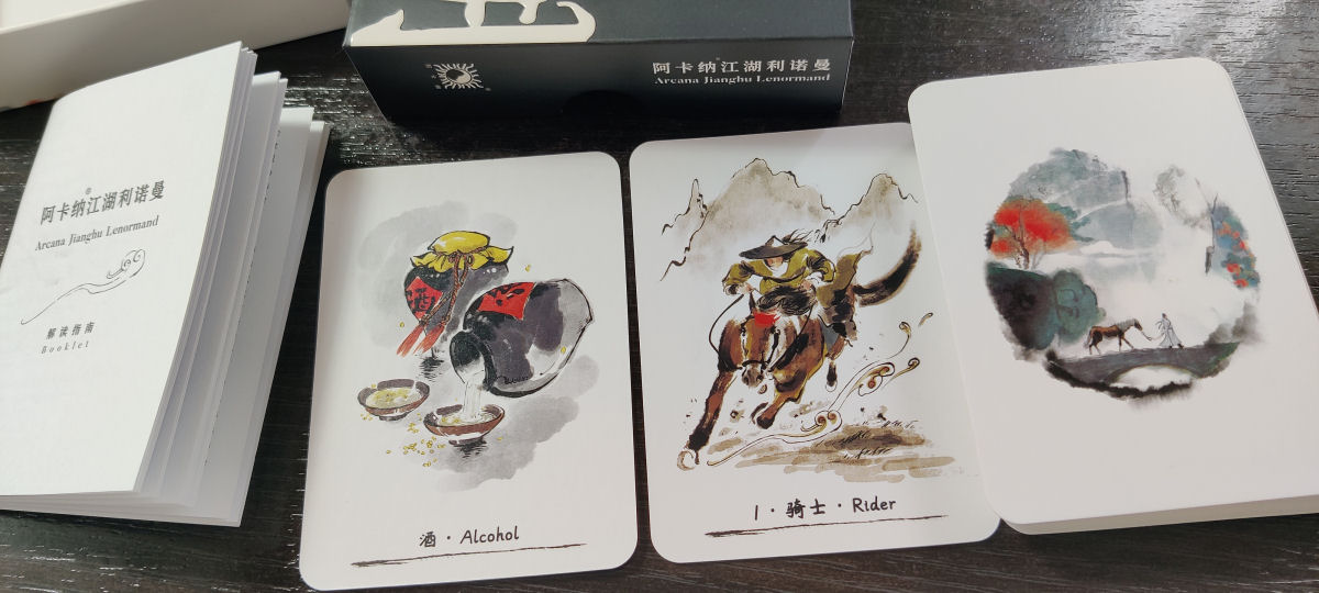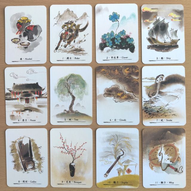 Jianghu expresses the cast of heroes and villains, the power structure of the world the Wuxia author has built. In this Lenormand deck, there are two versions for the Man and Woman cards (see above) — for the Man, the versions are Swordsman and Scholar; for the Woman, the versions are Swordswoman and Maiden.