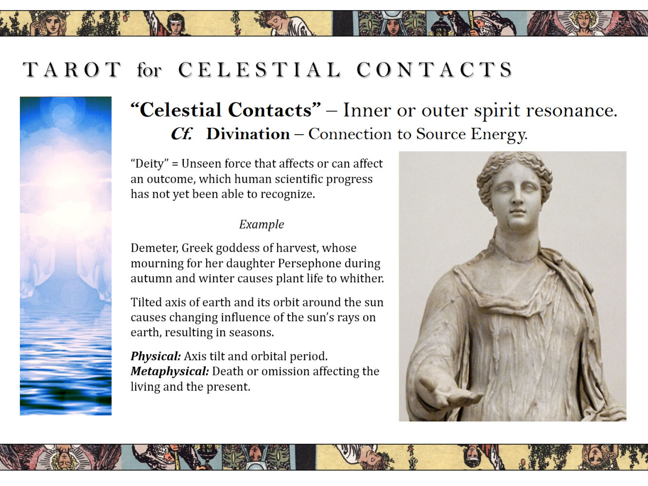 Celestial Contacts to connect with deities, angels, ascended masters, devas, or the metaphysical force affecting physical conditions; and