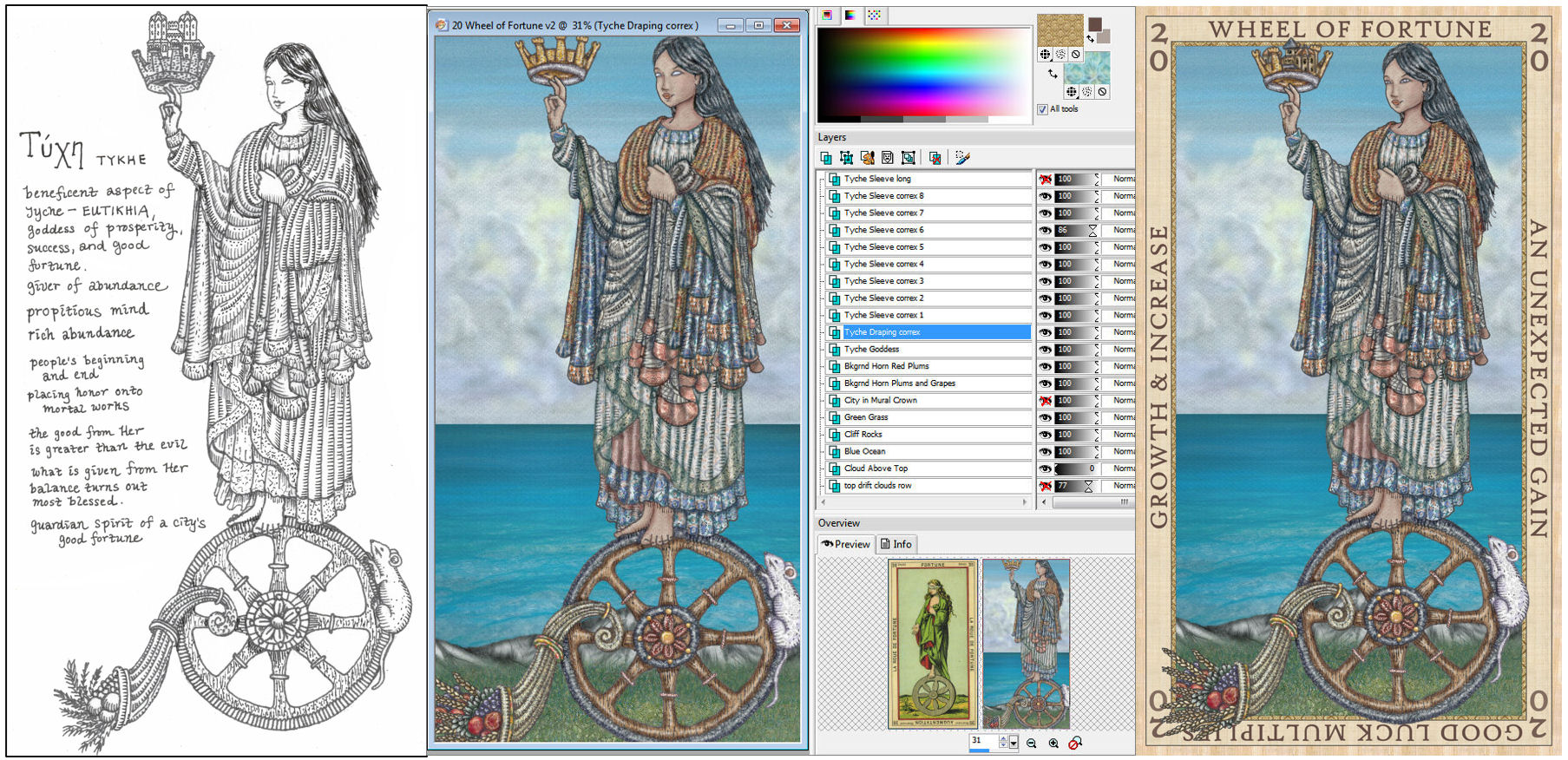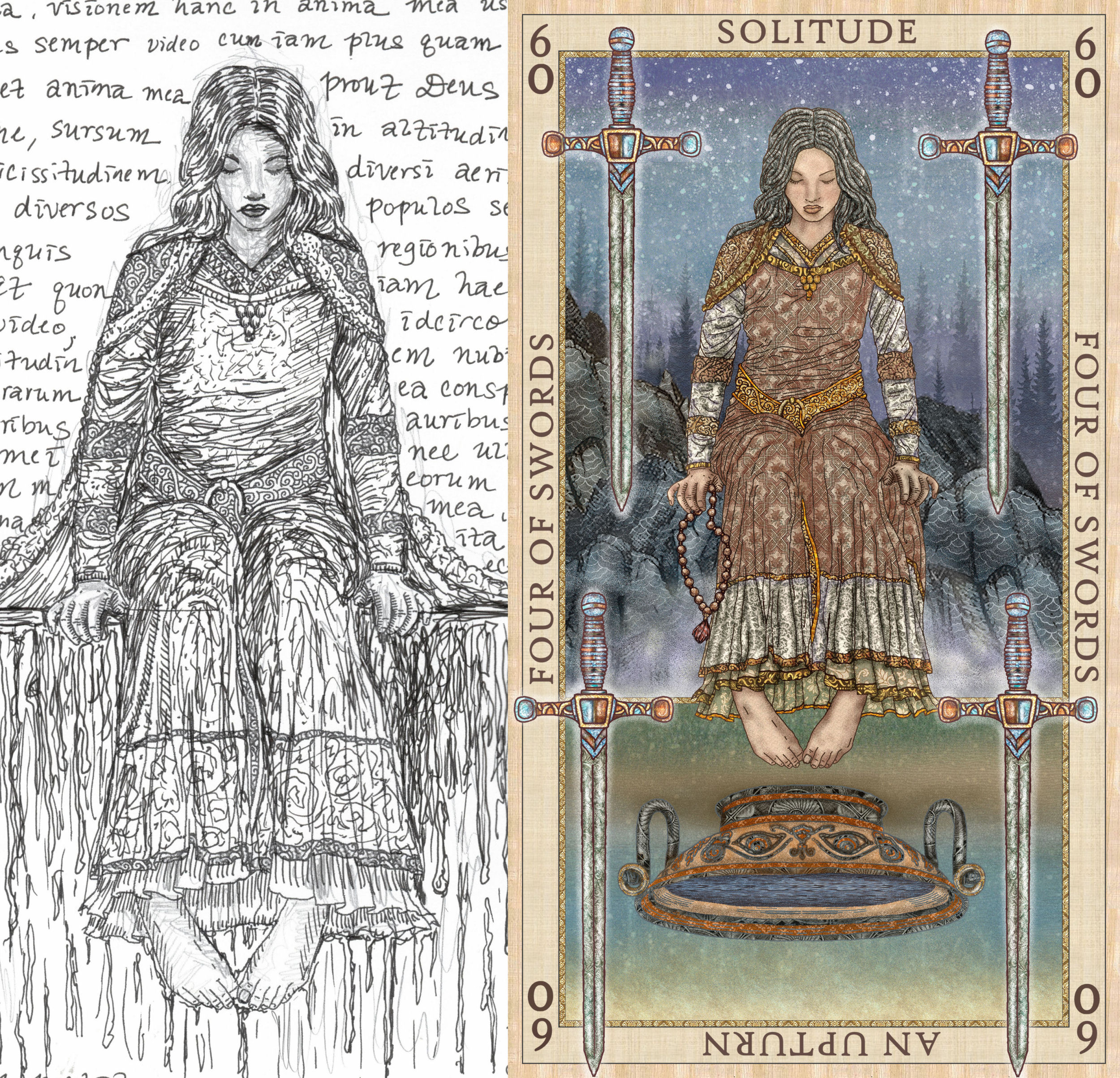 After I’ve scanned in my sketch, I digitally separate out the design elements into distinct layers, which makes it easier to rearrange the composition and ultimately set it inside the tarot card frame (where you see edges of design elements “breaking the fourth wall,” self-acknowledging that this is a tarot deck).