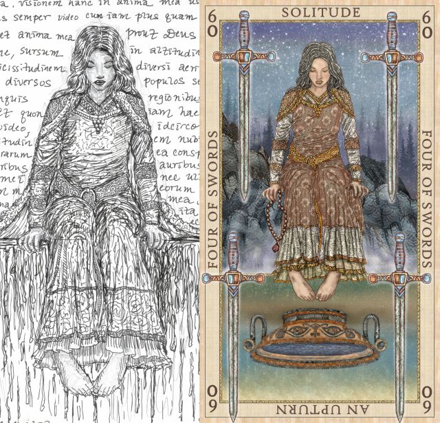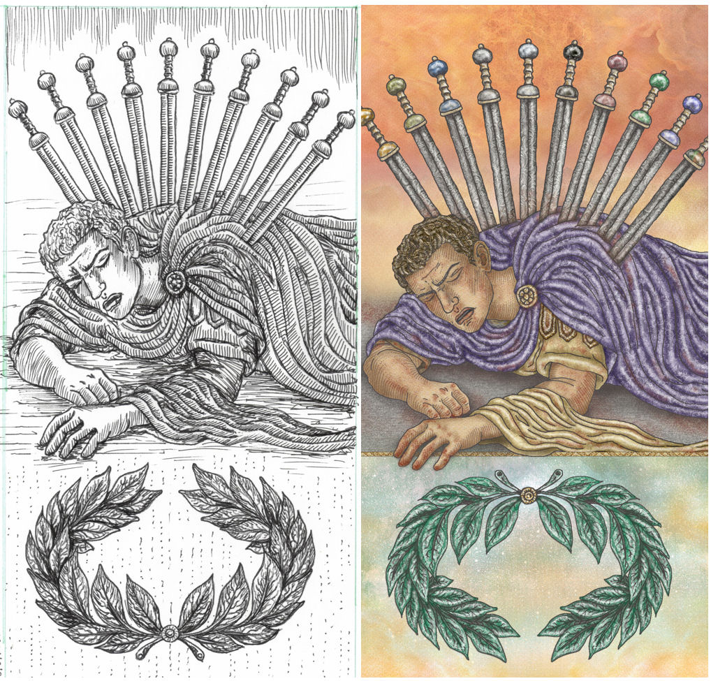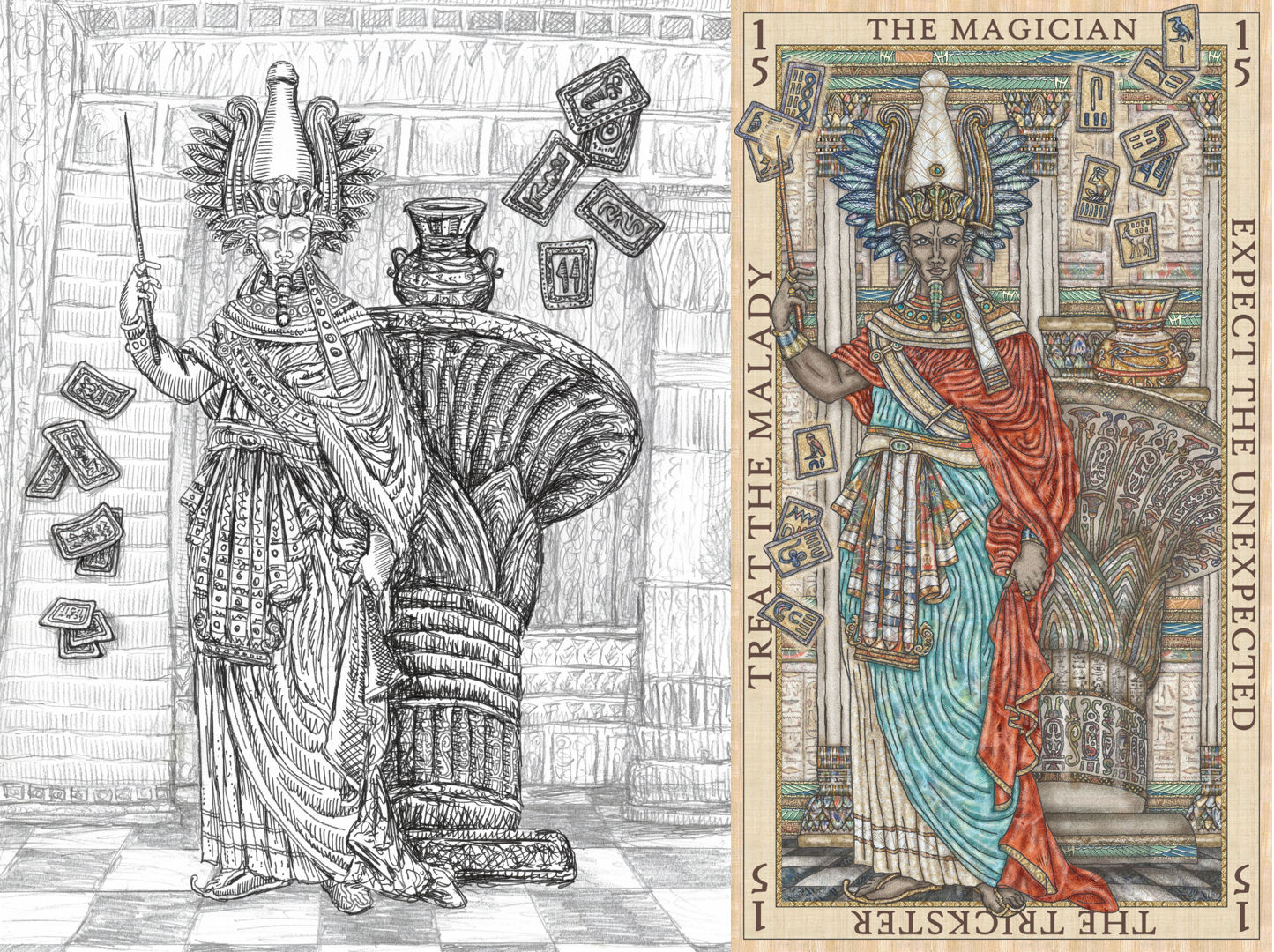 My process flips that, beginning with hand-rendered line sketches, then “applying pigment” digitally, our modern version of creating illustrations on engraved plates. Just as the 18th century tarot artisans used the technology of their time to balance reproducibility with human artistry, my hybrid process bridges traditional draftsmanship with the digital palette. Using two different mediums in hybrid becomes a dialogue between line and color.