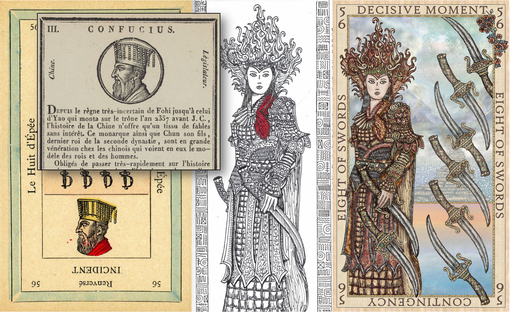 For the digital art, I use Jasc Paint Shop Pro v. 9.0, circa 2004. This artistic choice for the digital art component to be created in an obsolete software program that was once state-of-the-art (back in the 90s, when I first started exploring art as a medium) is itself commentary on nostalgia, reconstruction, and the very purpose behind a 21st century resuscitation of the Etteilla tarot system.