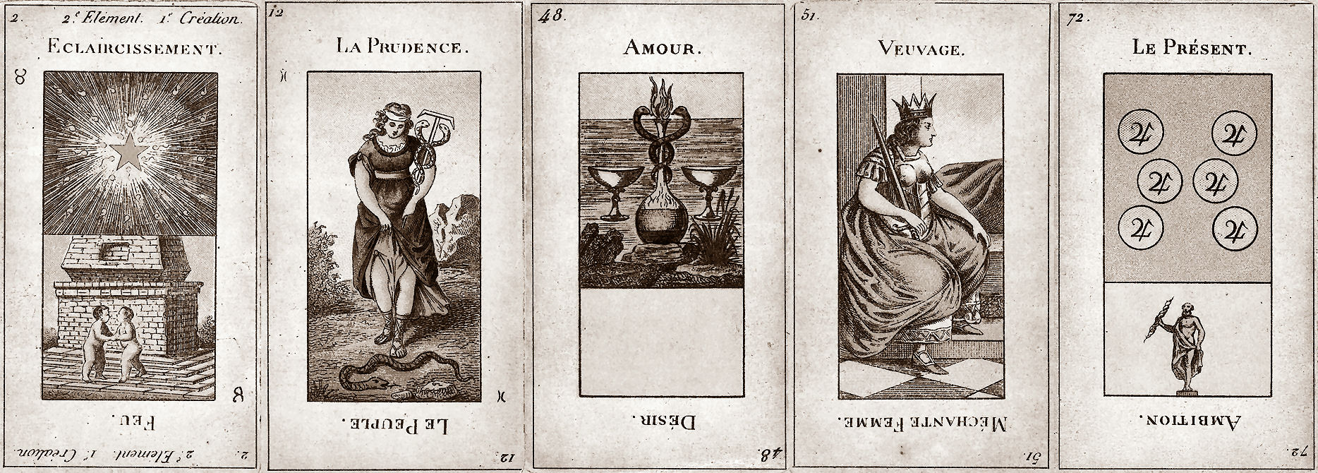 Le Grand Etteilla, Simon François Bloquel (aka Z Lismon) card images from the Julia Orsini book, Le Grand Etteilla, ou l’Art de tirer les cartes (1838).