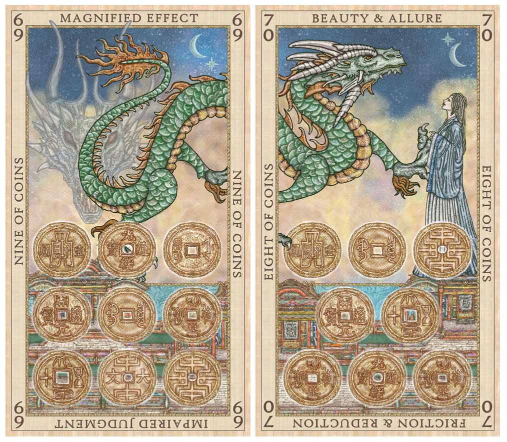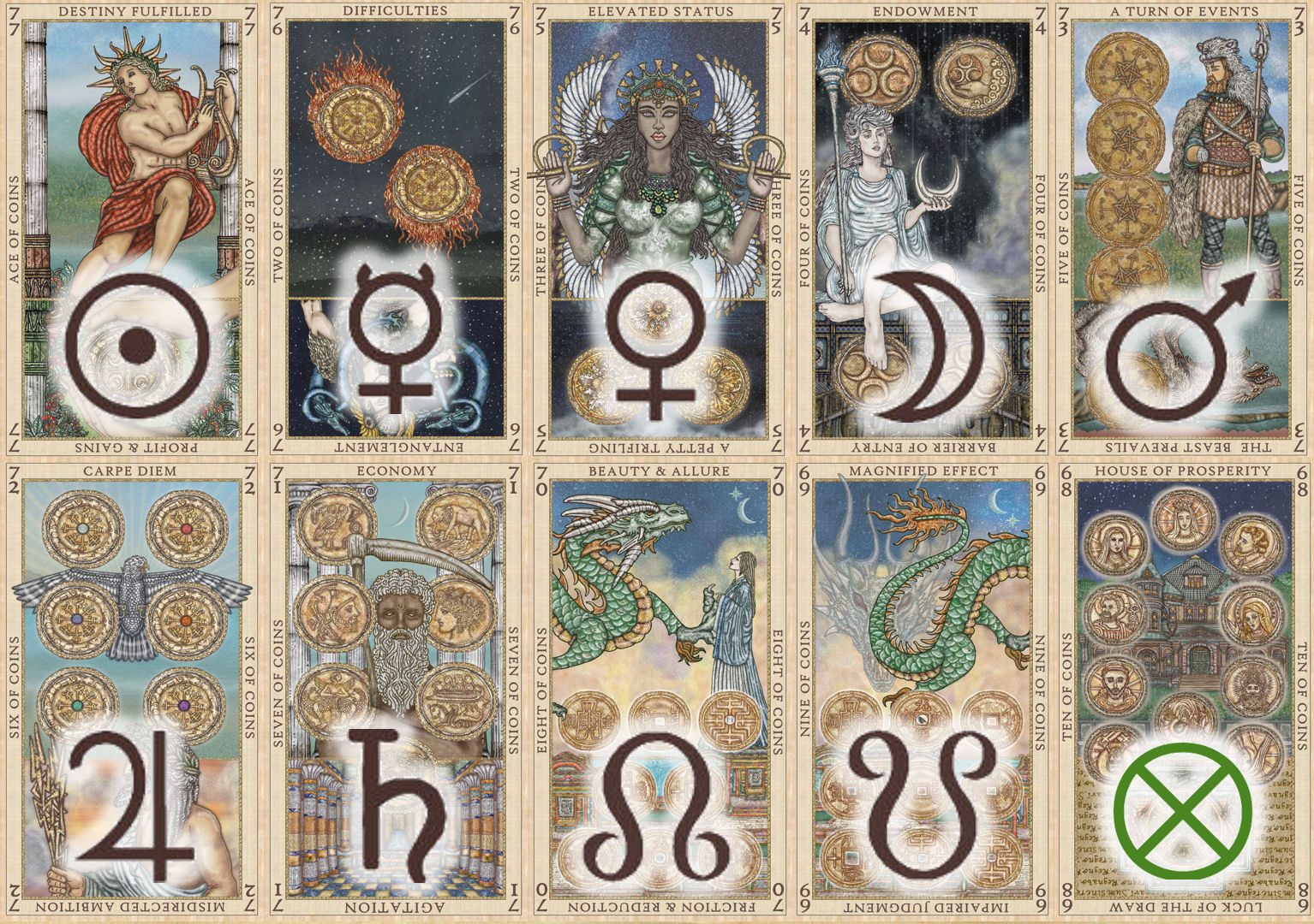 The Sacred Seven planets plus the lunar nodes and Hermetic Lot of Fortune correspond to the pips in the suit of Coins, where the Ace of Coins corresponds with the Sun, Two of Coins to Mercury, Three of Coins to Venus, and Four of Coins to the Moon, etc.
