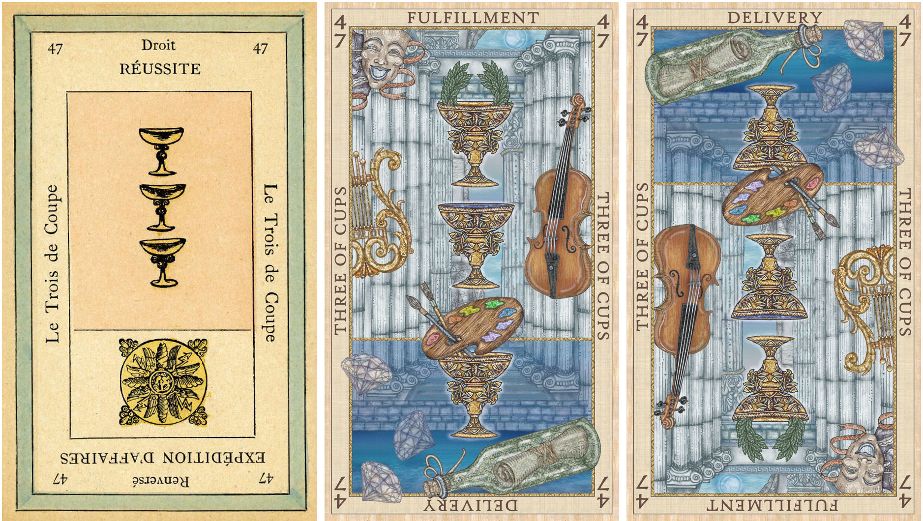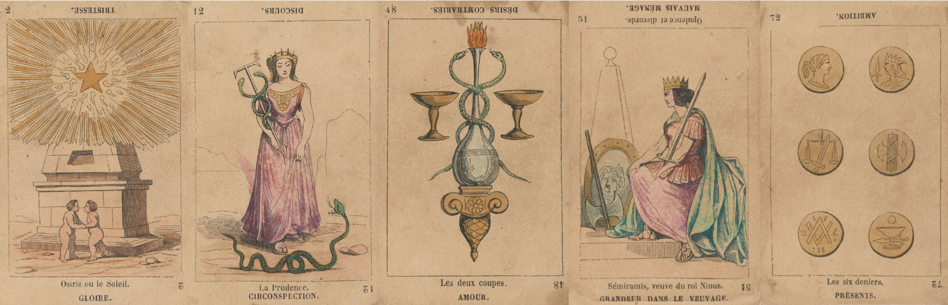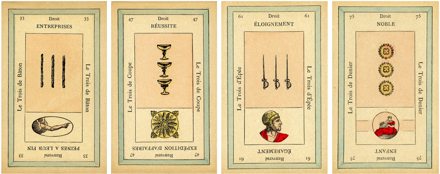 The Grand Etteilla Tarot diverged from the traditional Tarot de Marseille ordering, iconography, thematic symbolism, and meanings were assigned to the cards, both upright and reversed, often running in opposition to the popularized card meanings tarot readers today are used to.