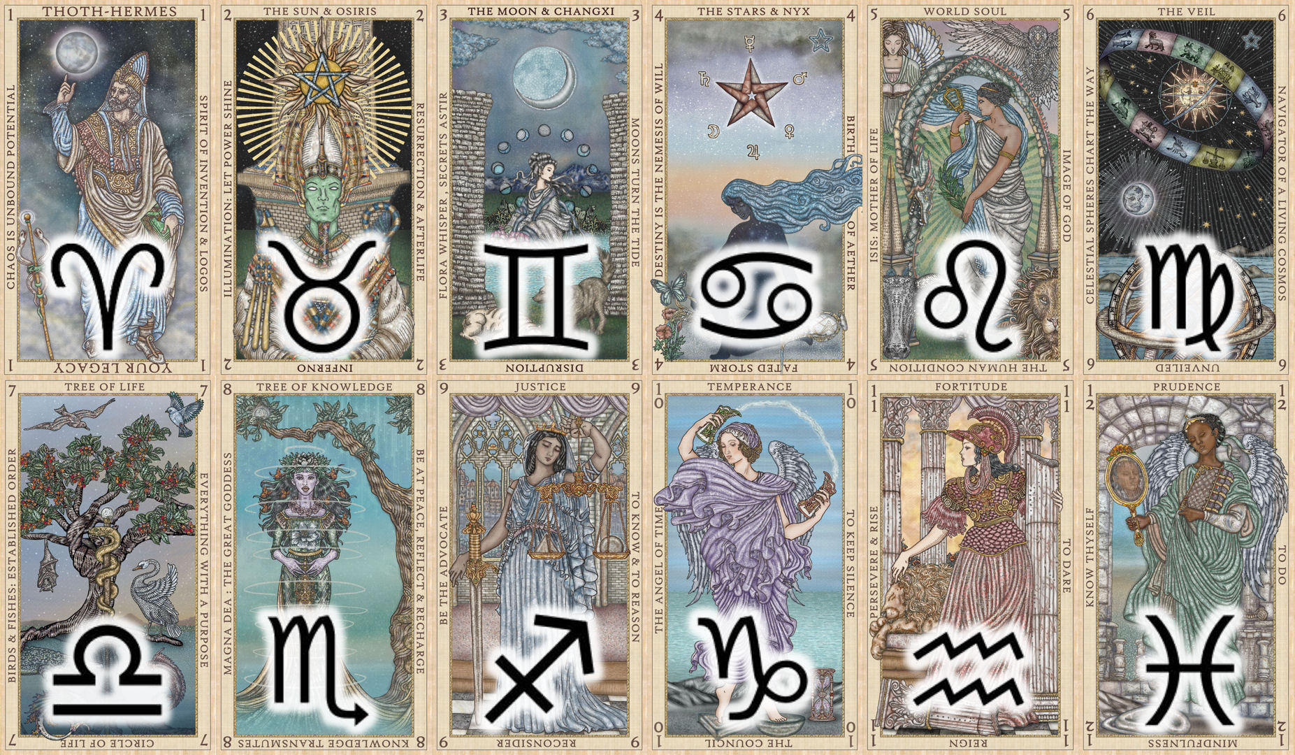 Cards 1 to 12 correspond with the twelve zodiac signs. And so instead of the more familiar Justice card being associated with Libra, here in Etteilla’s system, it’s Card 7, The Birds and The Fishes, and instead of The Lovers card associated with Gemini, here, it’s Card 3, The Plants, with imagery reminiscent of the more conventional tarot Moon card. Aquarius in this system is associated with Fortitude, instead of the more commonly associated Star card.