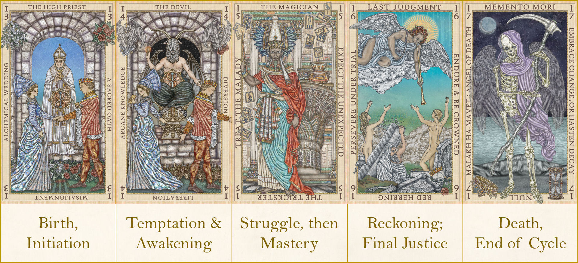 Cards 13 to 17 represent the human chain from birth to death, or five stages of the human life cycle– initiation into society (Card 13), rebellious adolescent youth (14), adulthood (15), maturation (16), and death (17).