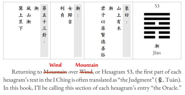 On p. 99, the trigram reference to Hexagram 53 are flipped. Instead of Mountain over Wind, it should read “Wind over Mountain.”