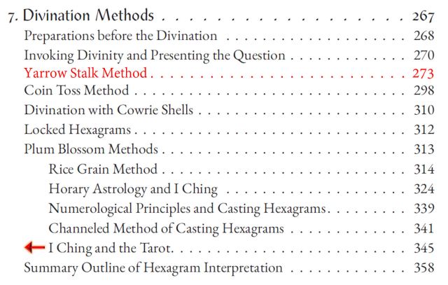 The Yarrow Stalk Method is missing from the Table of Contents. See above redline. I recommend making a note on this page of the TOC that the Yarrow Stalk Method begins on page 273.