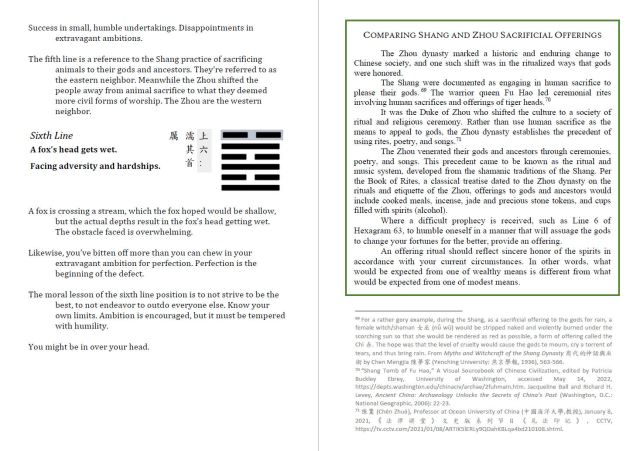 The above should go right before the commentary for the sixth line, “A fox is crossing a stream, which the fox hoped would be shallow, but the actual depths…” (page 745).