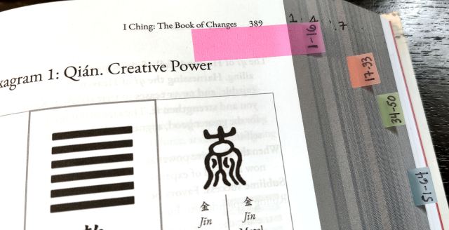 For easier referencing, I subdivided the hexagram translation pages with tabs. Personally I went with 1-16, 17-33, 34-50, and then 51-64, but go with subdivisions that make sense to you.