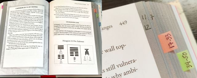I also added hexagram numbers to the translation section, numbering 1 through 64 corresponding with the hexagram entry pages. When a page consists of the tail end of the previous hexagram and the beginning of the subsequent, I’ll write in both hexagram numbers. See what I did to page 449 above as an example. The top half of p. 449 is still hexagram 11, but the beginning of the hexagram 12 entry appears on the bottom, so I numbered this page 11/12.