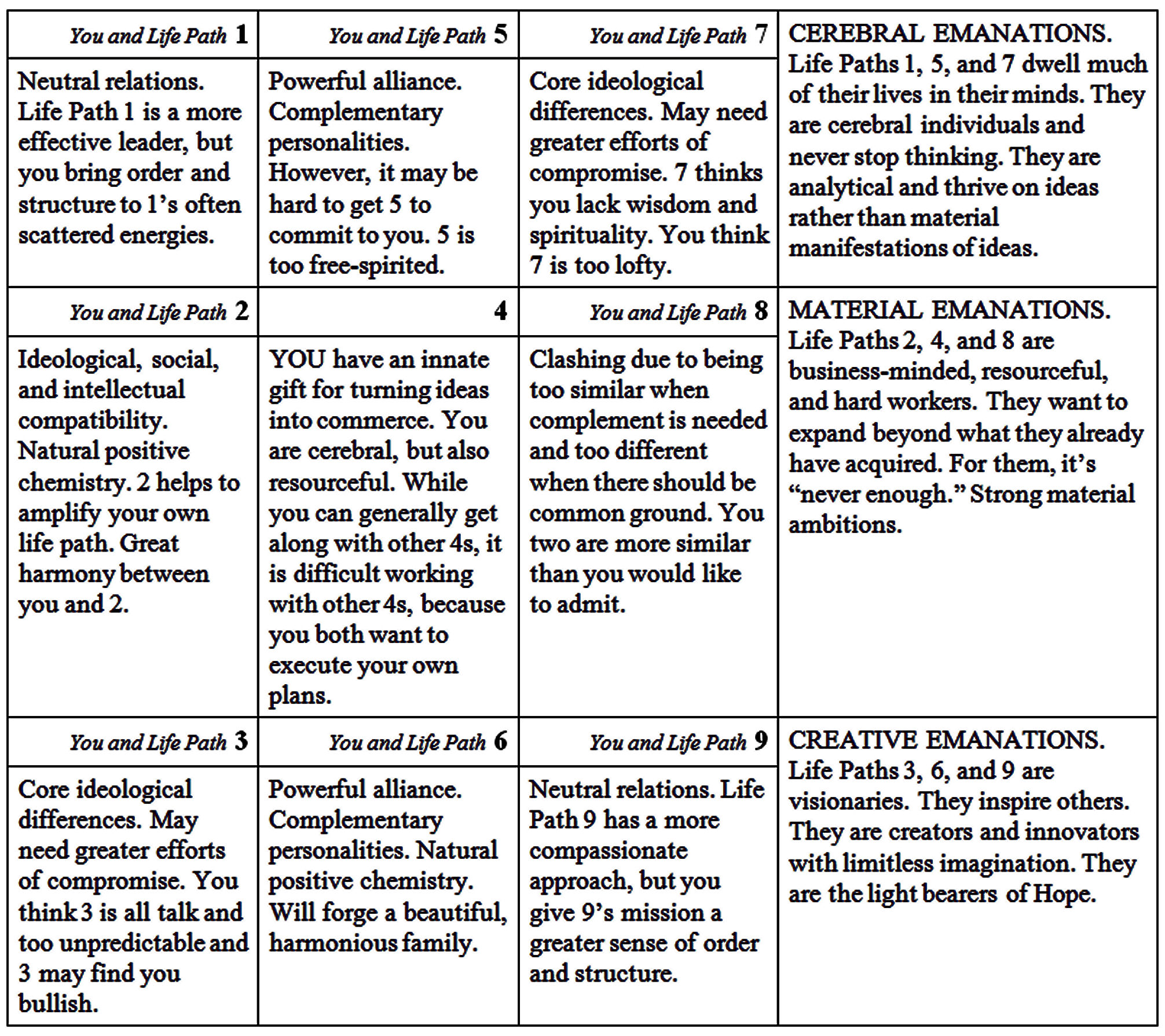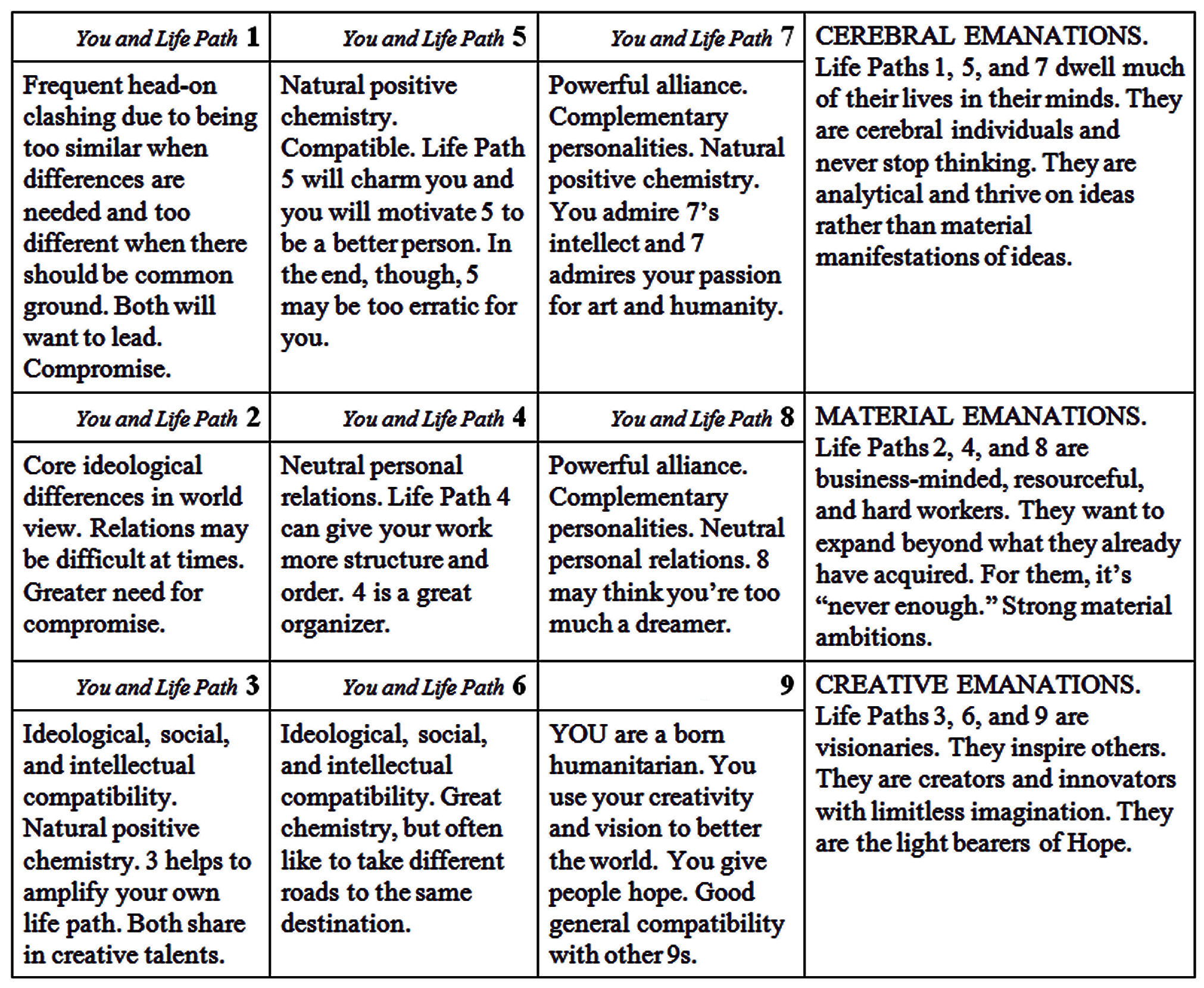 For example, I married someone with a Life Path number that isn’t compatible with mine according to these charts, but we have just a blessed time together. That is not to say that the charts are wrong, because the areas of tension and conflict that the charts point out between our Life Path numbers still exist. But through hard work and devotion, we overcome the areas of incompatibility and find amazing chemistry against the odds.