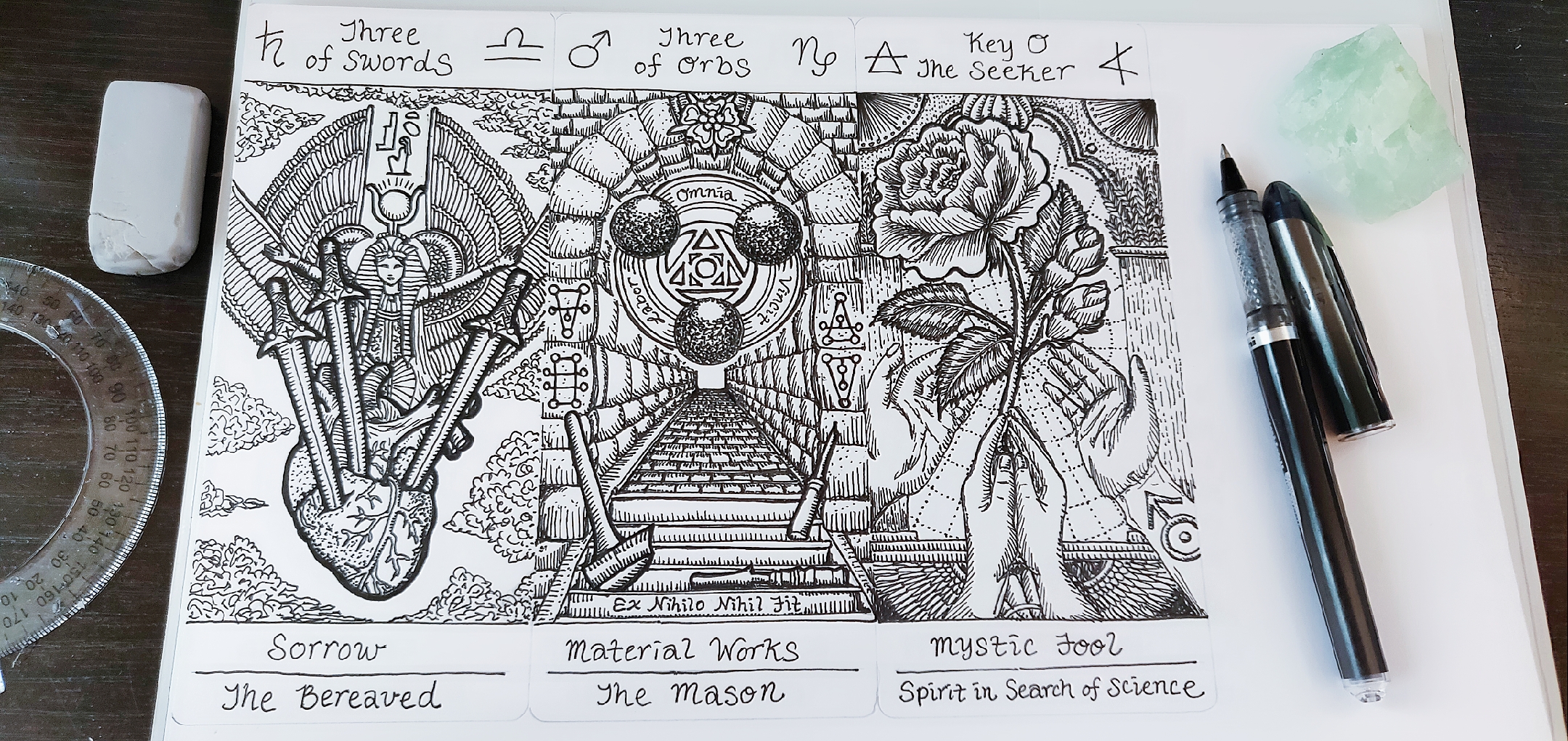 The artwork was done—as best as I could manage it—in the spirit of a Renaissance artist producing a hand-crafted tarot deck. Each and every illustration was drawn at actual tarot card size, so each original pen and ink drawing is approximately 7 cm x 12 cm, with the full card itself, including the handwritten captions, at approximately 7 cm x 16 cm.
