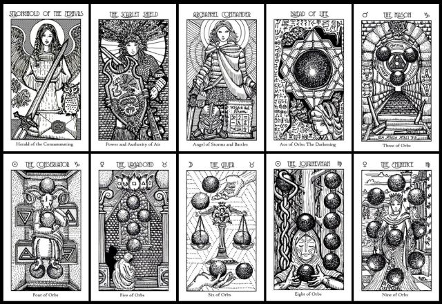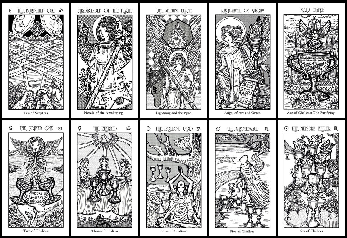 The pen and ink line drawings for all 80 cards took a month and a half to complete. I barely slept, barely ate, stumbled through every other aspect of life during that month and a half in a daze, and threw everything I got into drawing and the crafting of these cards.