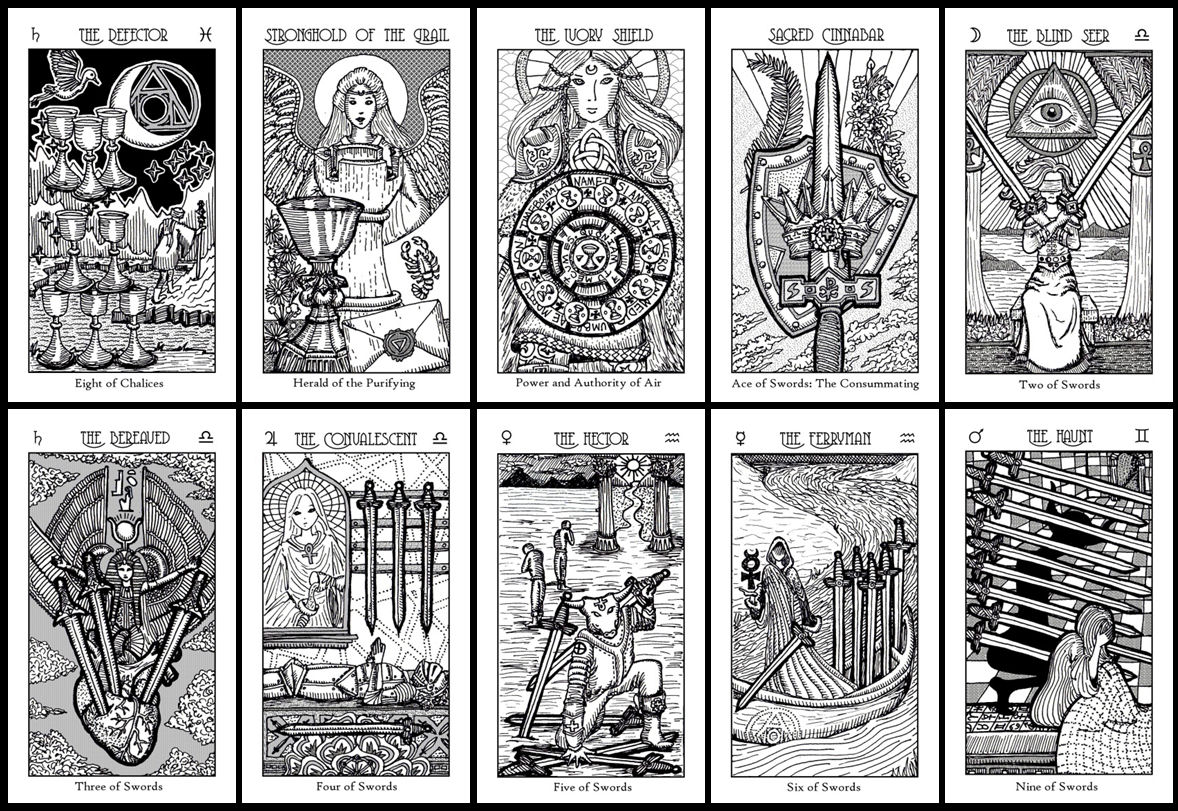 I tried to simulate medieval woodblock print art. All art in this deck are original pen and ink works hand-drawn by me, and not taken from actual historic woodblock prints. My only tools for drawing these cards were pencil, pen, straight edge, compass, and protractor.