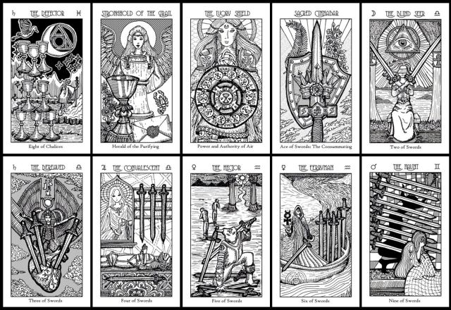 I aspired to design a tarot deck scion that grafted together the Rider-Waite-Smith and the Thoth, to create an offspring that was a merger of the two. In a self-assessment of the deck, I’d say physically the SKT bears a greater resemblance to the Rider-Waite-Smith deck, but in terms of how it feels, how it reads, the deck’s personality and emotional values, it’s more Thoth.