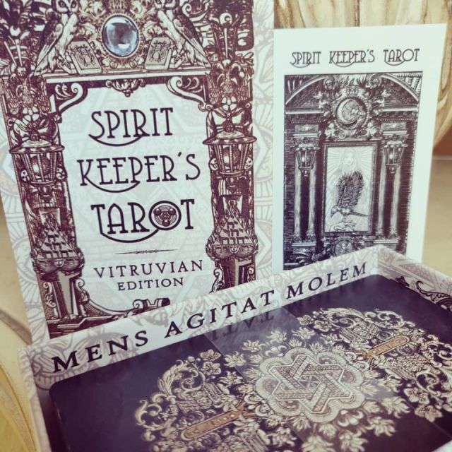 Spirit Keeper’s Tarot is a hand-illustrated 78-card tarot deck (with 2 additional versions of Key 0, for a total of 80 cards) inspired by late Renaissance woodcut prints, with symbology based predominantly on medieval European alchemy, Hermeticism, Zoroastrianism, astrology, the Kabbalah, Abrahamic angelology, Egyptian mythology, Sufism, and late Renaissance Christian mysticism.