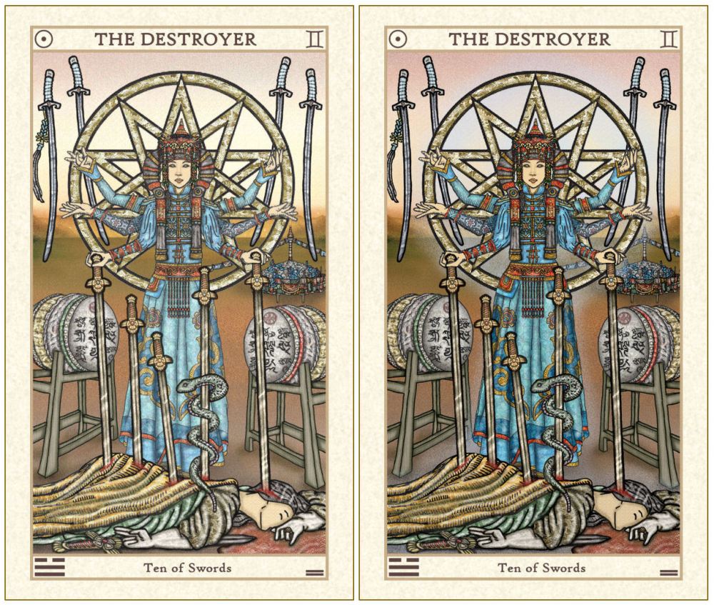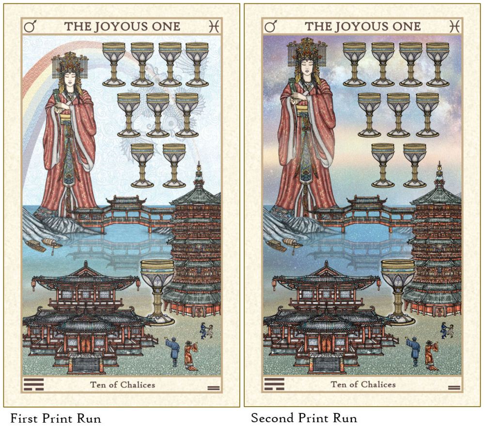 Although the cards are going to remain substantially the same, there may be a few minor revisions. The above is an example of a minor revision in the Ten of Chalices between the first print run (left) and this forthcoming second print run (right).