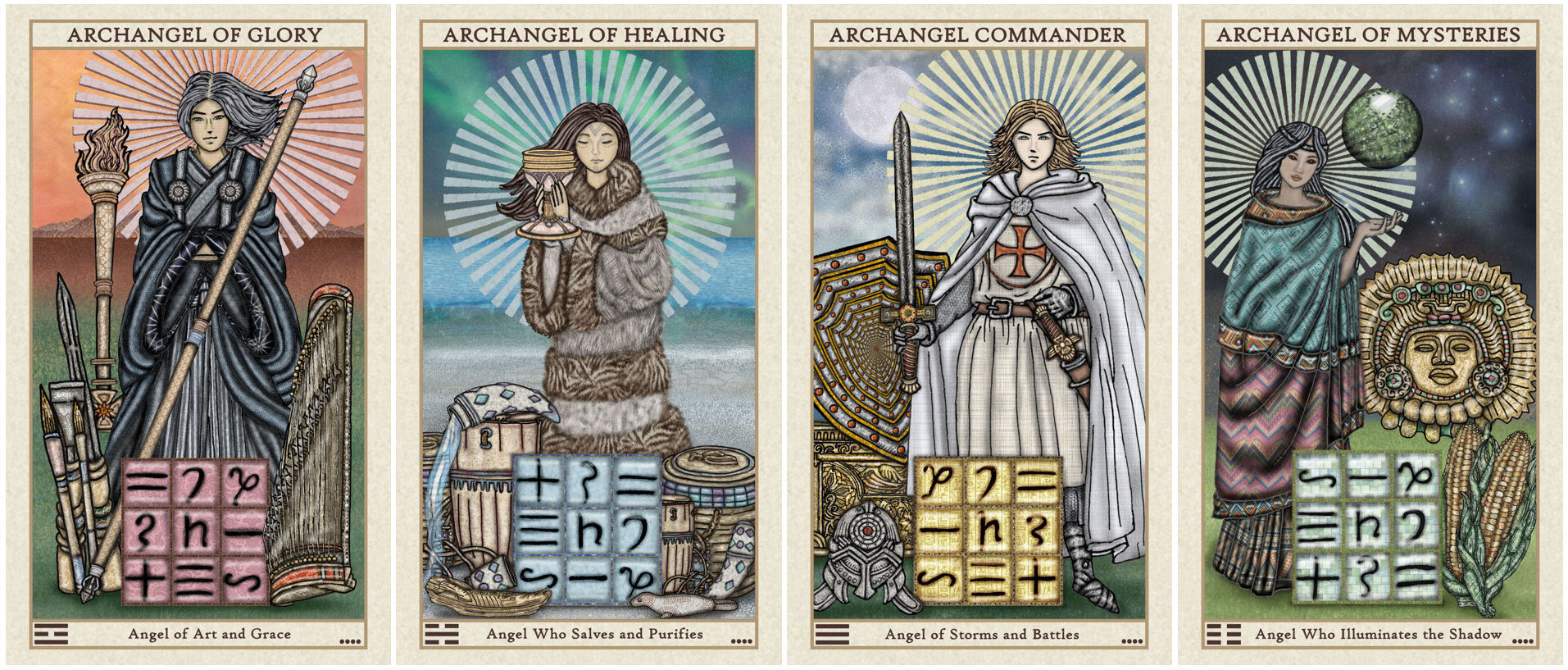 Tarot readers may be used to Kings presenting as male and Queens as female, but here, the King equivalents are Archangels, where the elemental forces of Fire and Air present as masculine in both levels, while Water and Earth present as feminine.