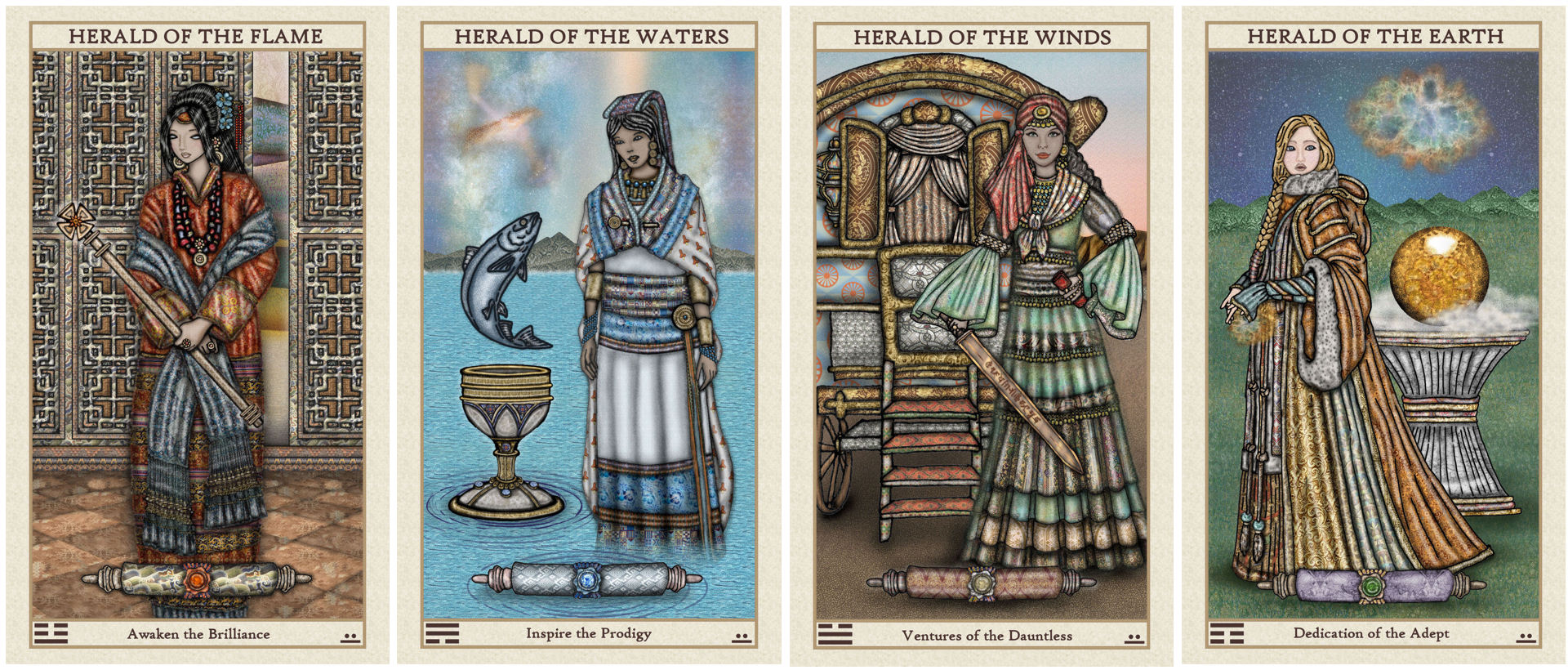 The Heralds represent the power of potential for the four elements, feminized. They signify the gestation of a force or influence forthcoming. They announce the arrival of greater gods, ancestors, or celestial spirits, letting us know that a particular Divinity has taken an interest in us, and have thus sent a scout or messenger our way.