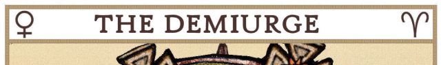 The Demiurge. Four of Scepters: The Demiurge builds our physical platform of success. An intangible idea has become a tangible work product, one that will take on a life of its own. The Demiurge marks progress, achievement attained, and marks a momentous rite of passage. The setting is the Holy Roman Empire in the early 14th century, the start of Renaissance humanism, and just before the Great Occidental Schism of 1378. The maiden on the left is Peace and Faith. The maiden on the right is War and Will. An omen of concord, fulfillment, completion.