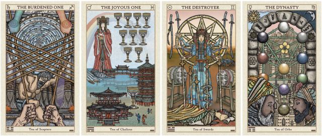 The Dynasty. Ten of Orbs:The setting is Manden Kurufaba (the Mali Empire in West Africa), 14th century Timbuktu. Here was the Golden Age of Trans-Saharan commerce and prosperity. The Dynasty is wealth multiplied. In the foreground, the old man faces the young man—they personify inheritance, legacy, and the multigenerational dynasty. This card portends advancing prestige. The Dynasty is the spirit of collective power that strengthens a tribe. The theme here is successorship. It can also suggest the personal impact on you of much greater national or global affairs. Something greater going on in the collective has reached down to directly affect you, at the individual and personal level. What the Ten of Orbs portends is gains to be had from that impact. While the Ten of Orbs marks a pinnacle of material wealth and success, the Book of Thoth reminds us that the success will quickly go inert if the pinnacle is not immediately put to productive use toward the greater good. Thus, with the benefits and gains you reap, you must direct those benefits and gains toward a greater good. Do not harvest all the blessings for yourself.