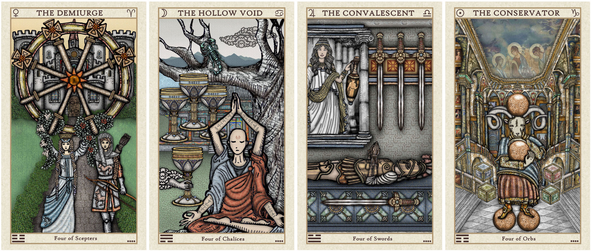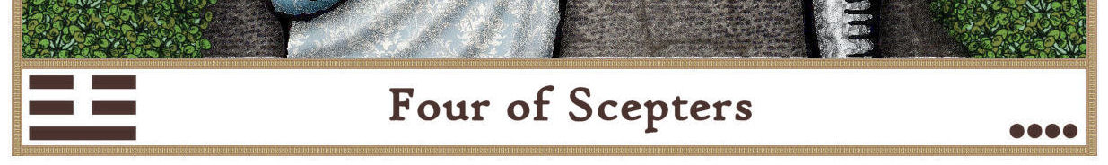 The Demiurge. Four of Scepters: The Demiurge builds our physical platform of success. An intangible idea has become a tangible work product, one that will take on a life of its own. The Demiurge marks progress, achievement attained, and marks a momentous rite of passage. The setting is the Holy Roman Empire in the early 14th century, the start of Renaissance humanism, and just before the Great Occidental Schism of 1378. The maiden on the left is Peace and Faith. The maiden on the right is War and Will. An omen of concord, fulfillment, completion.