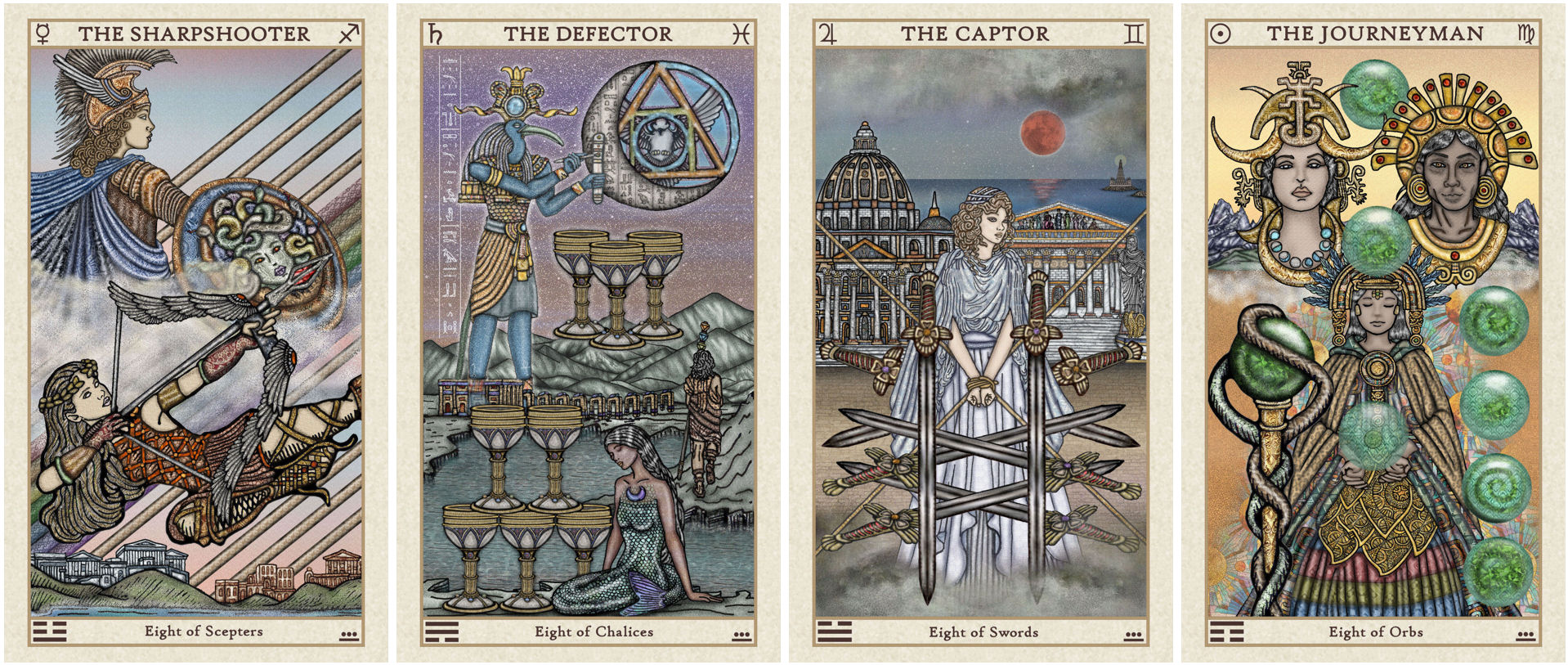The Sharpshooter. Eight of Scepters: Swift movement abounds around you. This is the spirit of marksmanship. Decisive action must be taken now. The Eight of Scepters is a welcomed omen. You will hit the target you’ve been aiming at, but move quickly, because time is of the essence. In the foreground, Artemis, the Greek archer goddess of the hunt, twin sister to Apollo, aims and shoots with her silver bow, a gift from her father Zeus. She is wearing her signature saffron hunting tunic. Artemis was the patron goddess of Sparta. Appearing in the skies is Athena, the goddess of war and wisdom, another daughter of Zeus, and patron goddess of Athens. She wields her father’s aegis, now adorned with the severed head of Medusa. An assembly of powerful goddess energies are present when The Sharpshooter appears. You are their messenger, a vessel for Divine Will.
