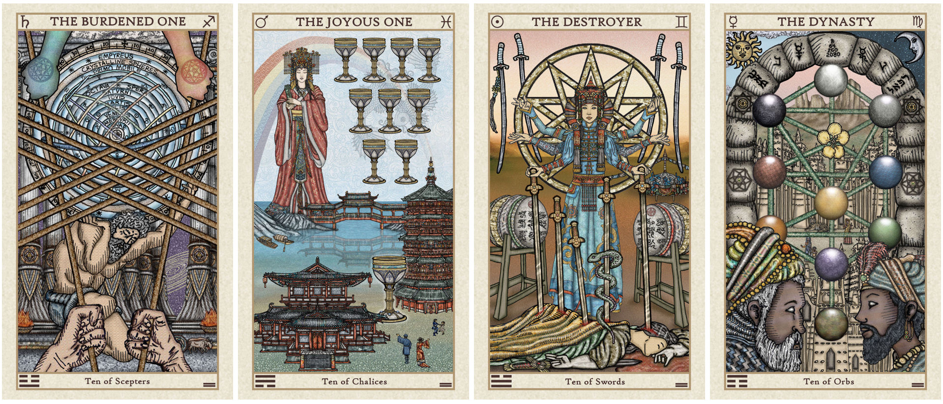 The maestro is again the novice. After one destiny is achieved, another is revealed—this is the Wheel of the Law. Increase to ascend. The Tens, bonded to the Heralds (Pages), express Shekhinah, present in Key 0: The Keeper. Here, the four elements are in their most concentrated material form.