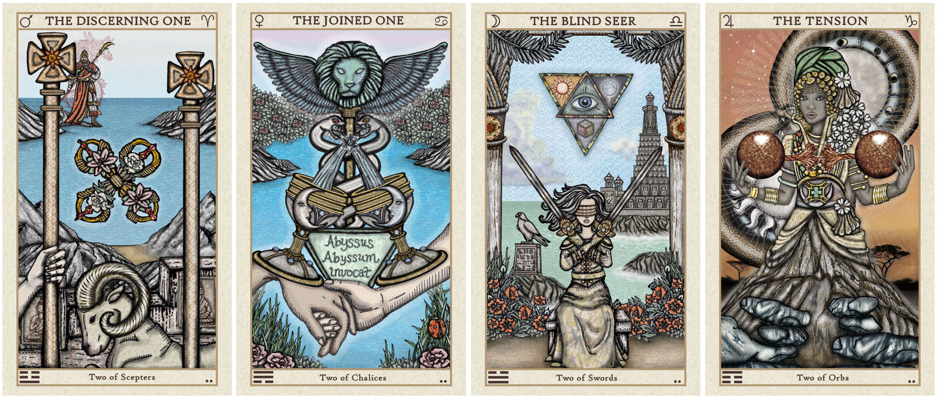 The Blind Seer. Two of Swords: The Blind Seer helps us navigate the stalemate between the Ego and the Self. The twin swords, or twin paths, form the cross that you bear. You have yet to attain the realization you need to make an intelligent, reasoned decision. So take the time to look inward. Arrive at an inner peace and restore a sense of calm before you proceed any further. One of the Seer’s swords is pointing toward the Lighthouse of Alexandria while the other points to a marble statue of Horus, the falcon-headed sky god of sovereignty. Here there is an implied presence of Ma’at, Egyptian goddess of truth, balance, and intellectual clarity. The esoteric thesis of the Two of Swords: when faced with an impossible choice between two ways, the best course to take is always the third.
