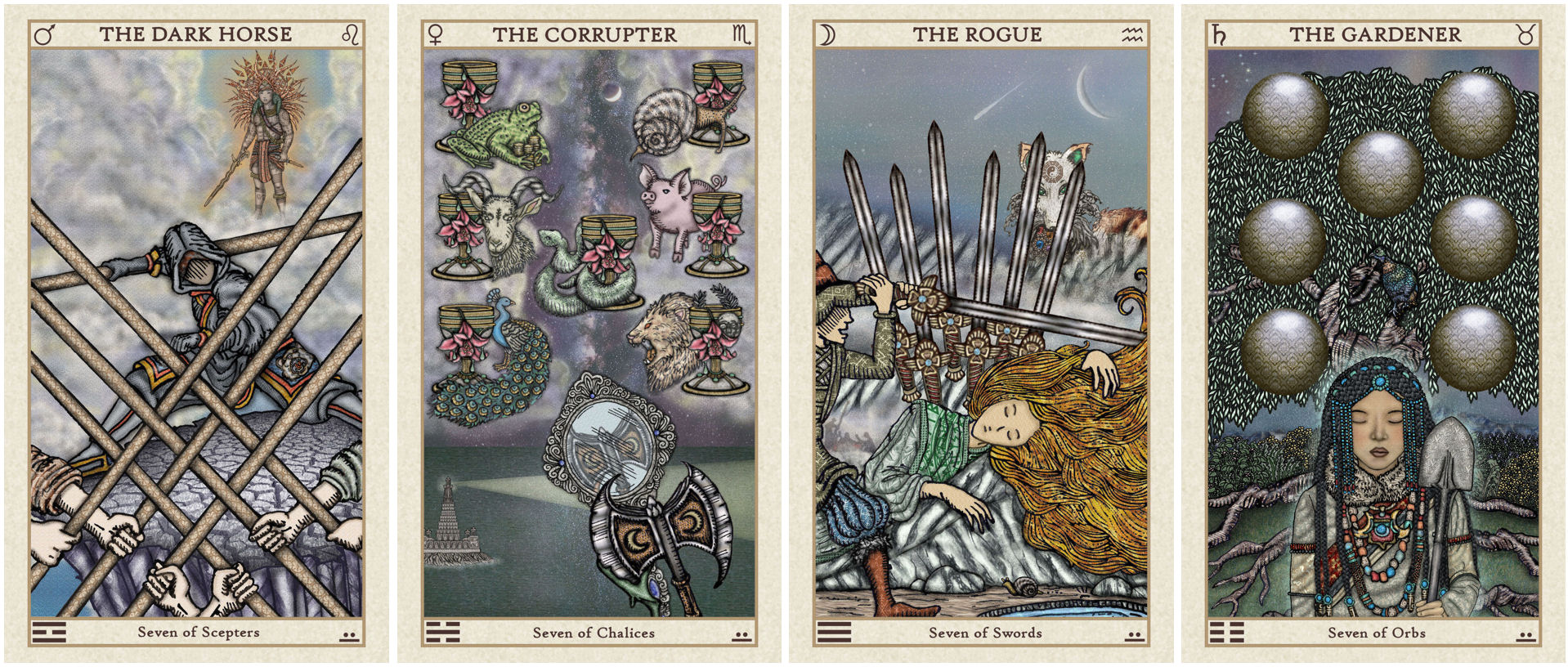 The Philosophers and Knowledge Keepers, interpreters of the Law. Transmuting the conceptual into the material through Logos. The endurance of the world-weary spirit. Selenite, snowflake obsidian, or sodalite. Sevens mark victory. This is also a realm of the fae, of sprites, of creativity, and of strength.