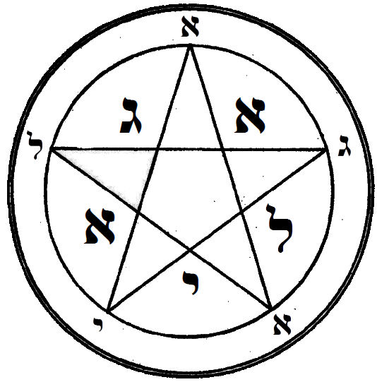 The more common representation of the First Pentacle is what you’ll see above, where the Hebrew letters for the angelic spirit name AGIEL (אגיאל) are inscribed around the pentagram counter-clockwise and then around the outer ring clockwise.
