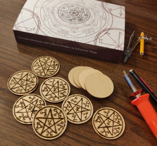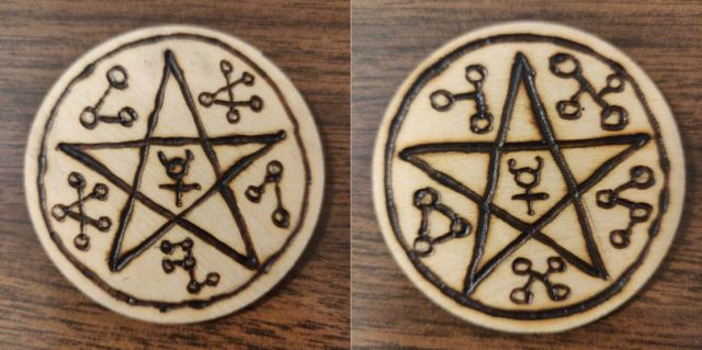 I was working with birch wood for the wood’s protective qualities (metaphysical correspondences) and carved the design into the wood with a wood-burner (pyrography– writing with fire! ooh, how fun!). My pentacles are also two-sided. I’ll talk about what I did with the back side of the pentacle later in this walk-through.